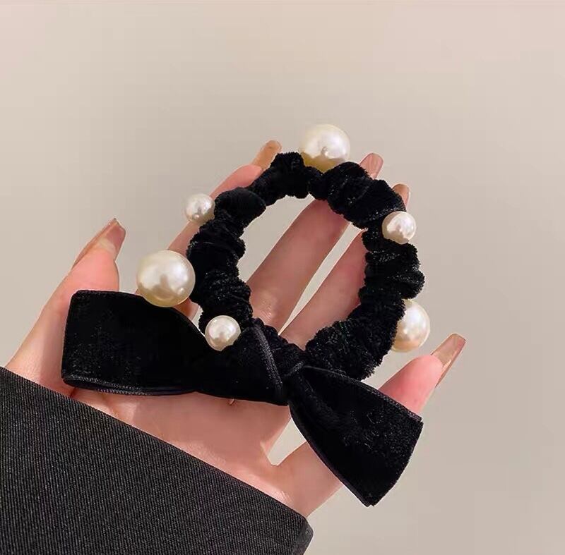 ベロアの上品生地にホワイトパールがあしらわれたヘアアクセサリー。手首に付けてワンポイントのアクセサリーとしてもお使い頂けます♪